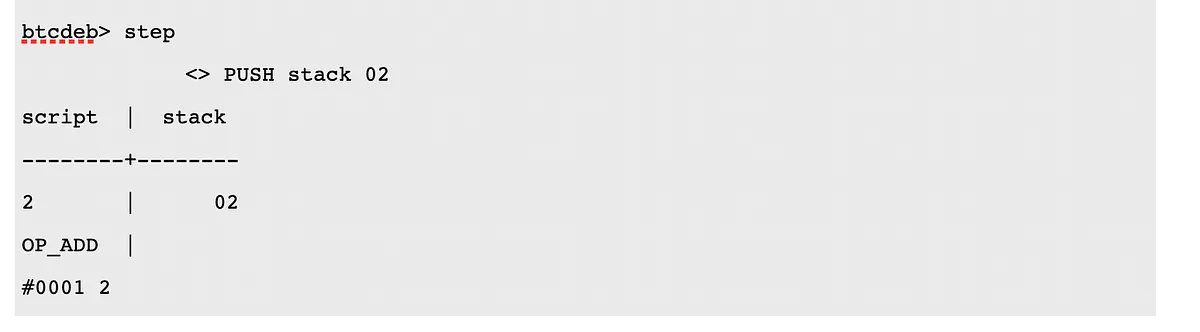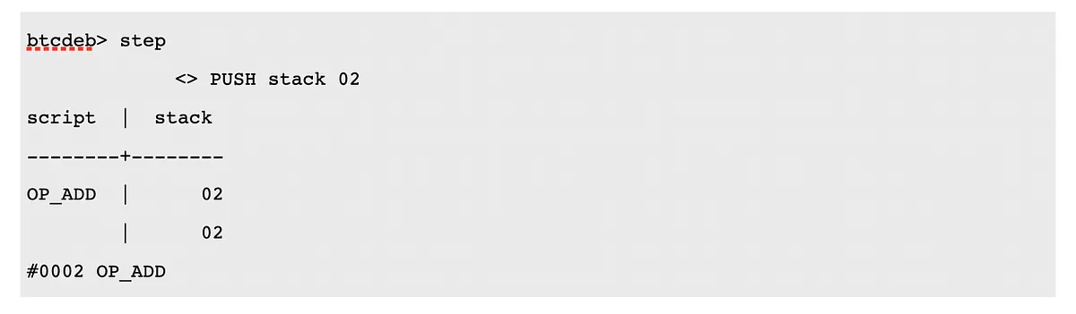 L’operazione che vogliamo fare è una somma 2 + 2, quindi secondo l’annotazione polacca prima mettiamo 22 e poi l’operazione somma, OP_ADD.